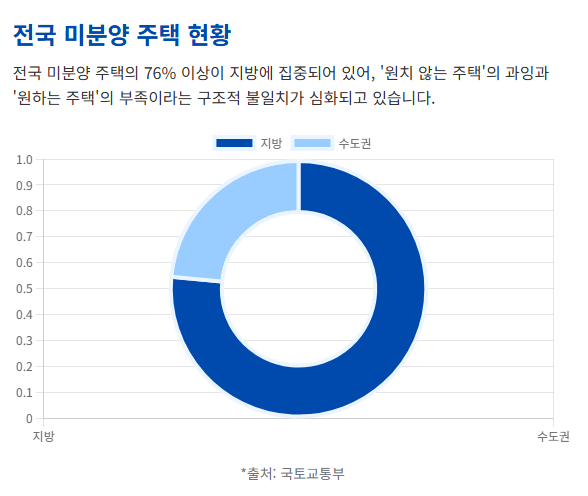 이와 대조적으로, 미분양 주택 문제는 여전히 시장의 부담으로 남아있다. 2025년 6월 말 기준 전국 미분양 주택은 63,734호로 소폭 감소했으나, 그중 76.5%(4월 기준)가 지방에 집중되어 있다. 더 큰 문제인 '준공 후 미분양' 물량도 26,716호에 달해 지방 시장의 침체가 구조적 문제임을 보여준다.