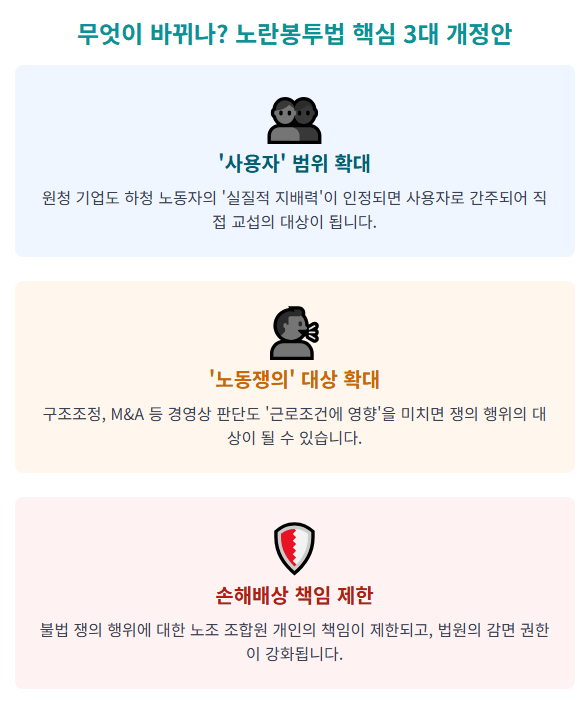 개정안은 현행 「노동조합 및 노동관계조정법」의 세 가지 핵심 조항을 근본적으로 변화시킵니다.