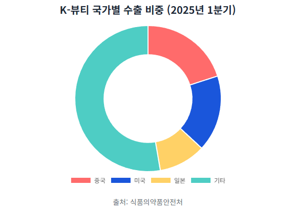 현재 K-뷰티 산업에서 나타나는 가장 중요한 전략적 변화는 역사적으로 과도했던 중국 시장 의존도에서 성공적으로 벗어나고 있다는 점이다. 아래 표에서 볼 수 있듯이, 중국은 여전히 단일 국가로는 최대 시장이지만, 다른 지역의 폭발적인 성장으로 인해 전체 수출에서 차지하는 비중은 점차 감소하고 있다.