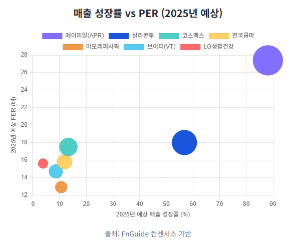 이 매트릭스는 K-뷰티 산업 내의 뚜렷한 양극화를 명확히 보여준다. '성장 챔피언' 그룹인 에이피알, 실리콘투, 브이티는 월등히 높은 자기자본이익률(ROE)과 성장률을 기록하고 있으며, 이는 이들의 높은 주가순자산비율(PBR)을 정당화하는 요인이다. 특히 ROE는 기업의 자본 효율성과 수익 창출 능력을 보여주는 핵심 지표로, 신흥 강자들이 기존 대기업 대비 얼마나 효율적으로 주주 가치를 창출하고 있는지를 극명하게 드러낸다. 반면, '전통의 강자'들은 낮은 밸류에이션에도 불구하고 성장성과 수익성 지표가 상대적으로 부진한 모습이다. '제조업 강자'들은 이 두 그룹의 중간에 위치하며, 안정적인 성장과 합리적인 밸류에이션을 제공한다.