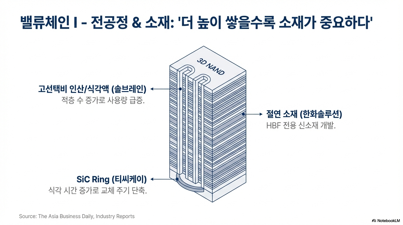 3. 솔브레인 & 티씨케이 (소재/부품): 400층 넘게 쌓으려면 특수한 식각액(솔브레인)과 고온을 견디는 부품(티씨케이의 SiC Ring)이 엄청나게 많이 들어갑니다.