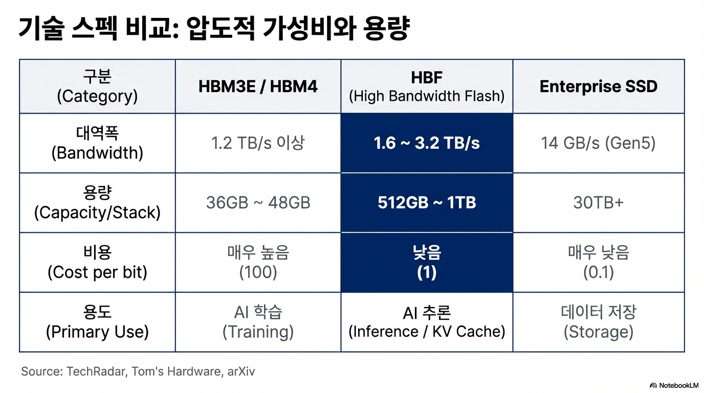 HBF는 HBM보다 용량은 10배 이상 크면서(최대 4TB), 가격은 훨씬 저렴합니다. 속도 역시 일반 SSD보다 월등히 빨라(1.6~3.2TB/s) HBM의 병목 현상을 해결할 가장 현실적인 대안으로 꼽힙니다.