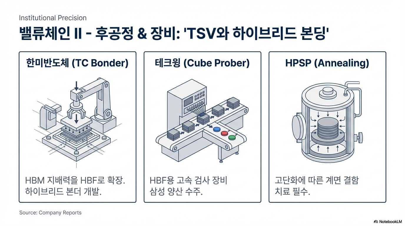 1. 테크윙 (검사): HBF는 속도가 워낙 빨라 기존 장비로는 검사가 불가능합니다. 테크윙은 초고속 검사 장비인 **'큐브 프로버'**를 개발해 삼성전자로부터 이미 양산 수주를 따냈습니다. 독점적 지위가 예상됩니다.